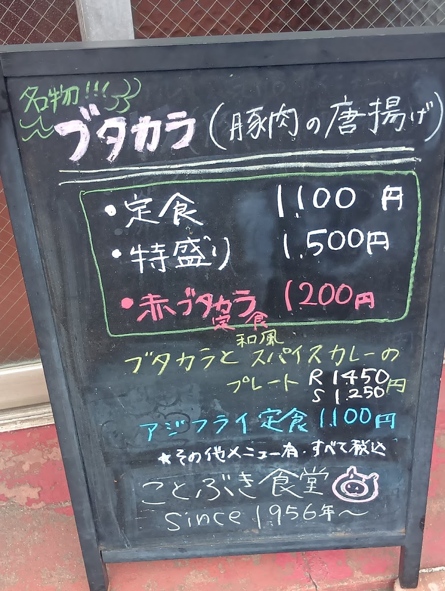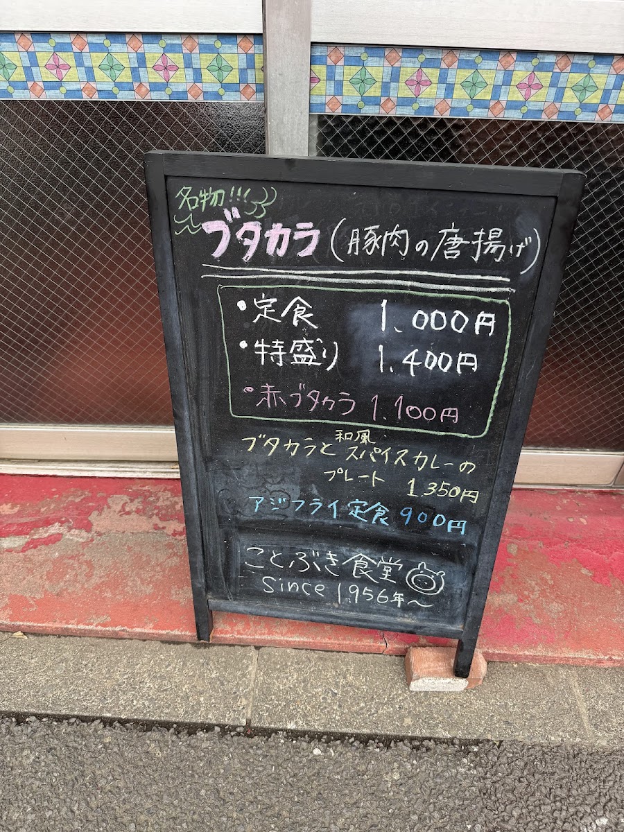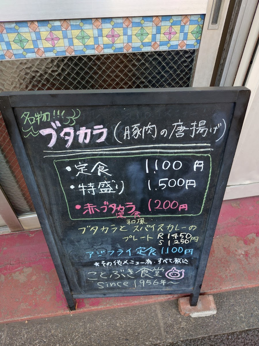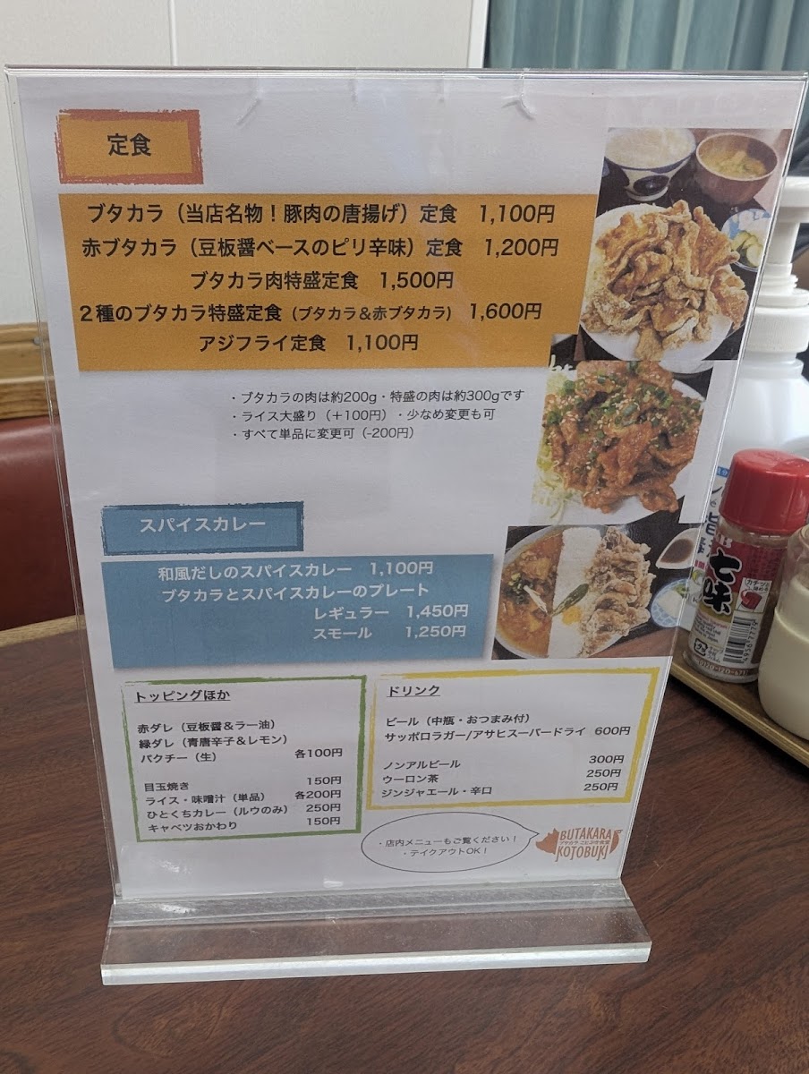 Overall, the menu at Kotobuki Shokudo leaves a strong impression as a hearty, satisfying lineup that balances classic comfort with a bit of creative flair. The generous portions of 肉特盛ブタカラ定食 stand out immediately, while the combination plate ブタカラとスパイスカレープレート offers a great way to experience multiple flavors at once. Side options like セットの半チャーハン complement the main dishes well, and classics such as アジフライ, からあげ, and 餃子 500円 provide familiar, crowd-pleasing choices. The menu also shows character through items like ニラ玉 and the flavorful 和風だしスパイスカレー, which pairs nicely with 付け合わせお新香 for a balanced meal. Even simple additions like コーラ round out the experience, and the clearly priced 和風 だし の スパイス カレー 900 円 offers good value. Altogether, the menu feels thoughtfully put together, filling, and very satisfying for anyone looking for a comforting, well-rounded Japanese meal.